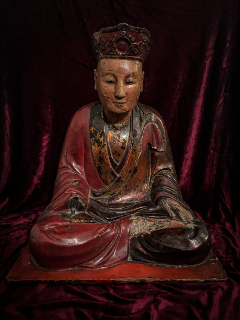 E03 Statue de grand dignitaire vietnamien en bois laqué polychrome