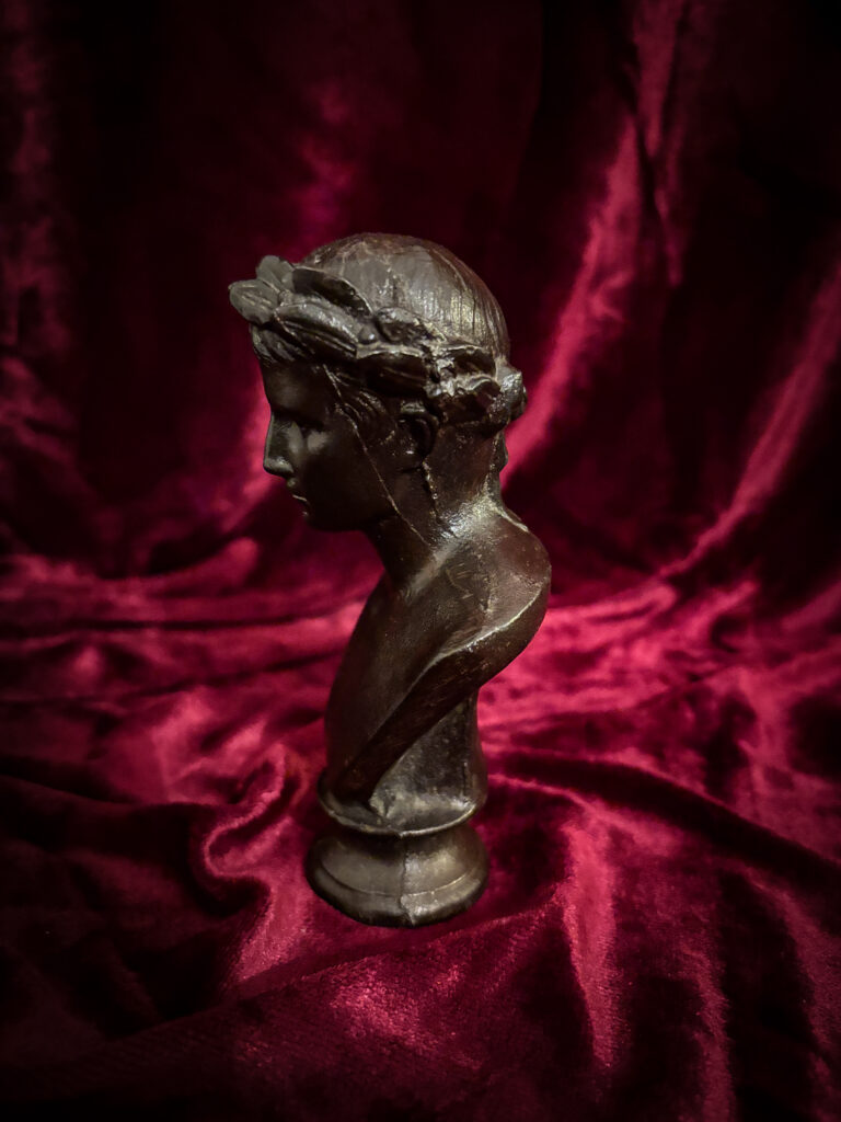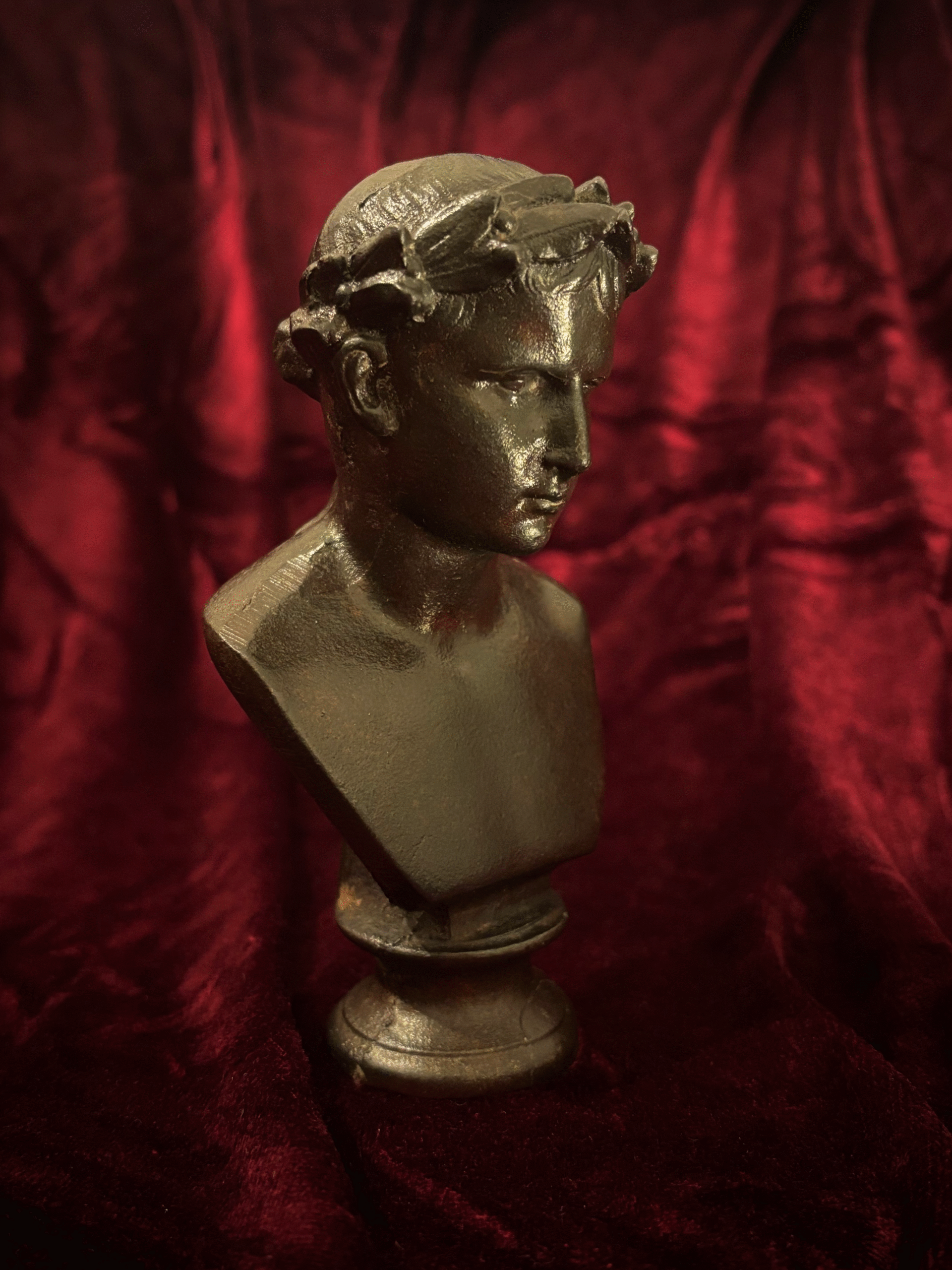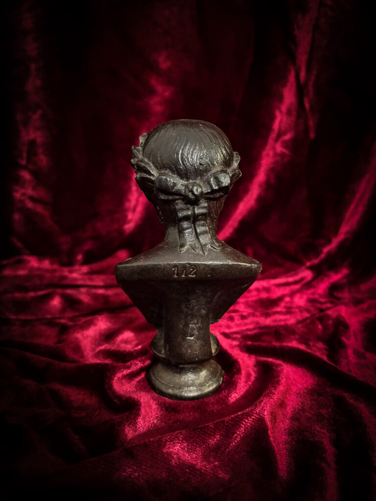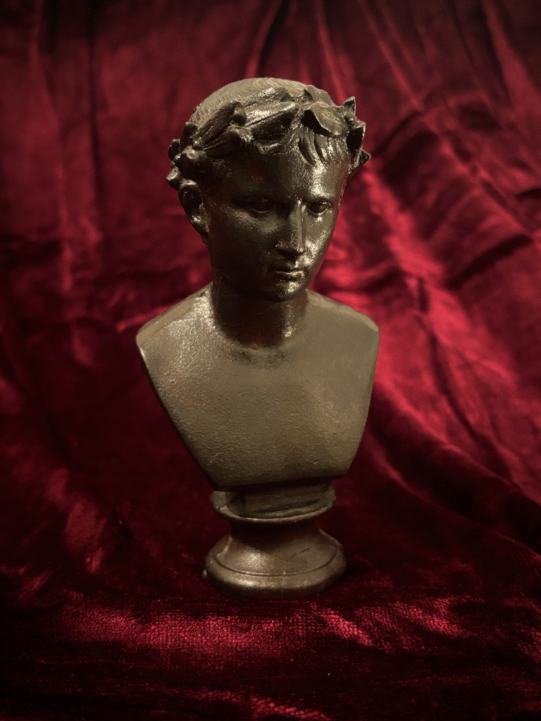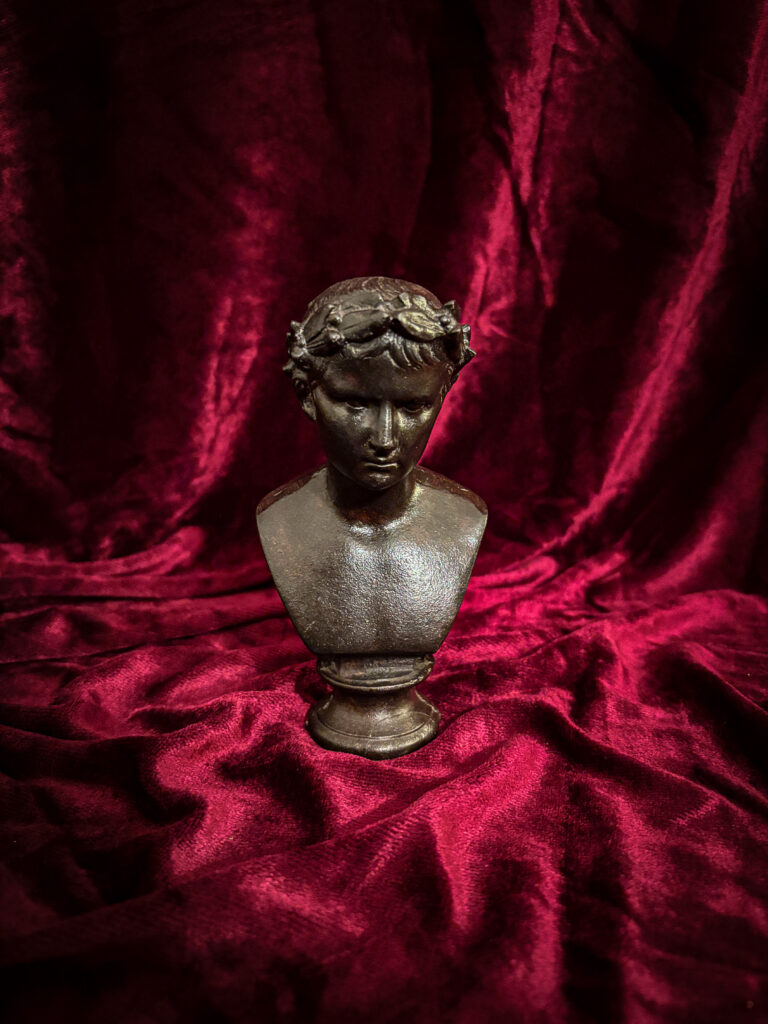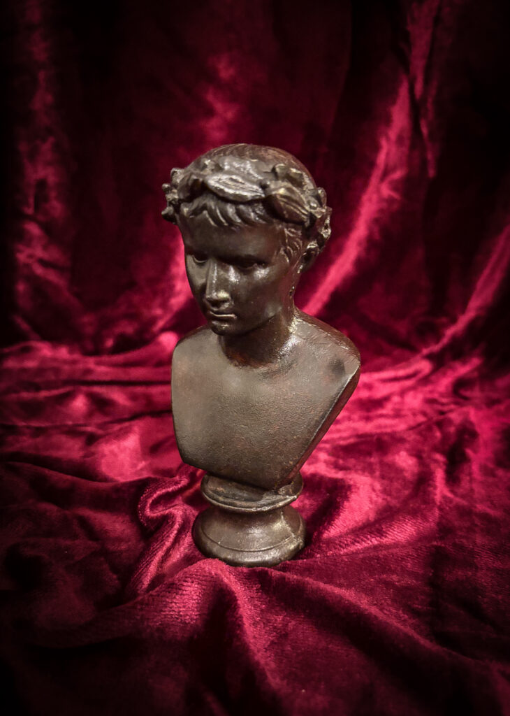 Charmant et peu courant buste en fonte à patine noire sur piédouche figurant l’Empereur Auguste, la teinte ceinte d’une couronne de laurier nouée à l’arrière par un ruban.