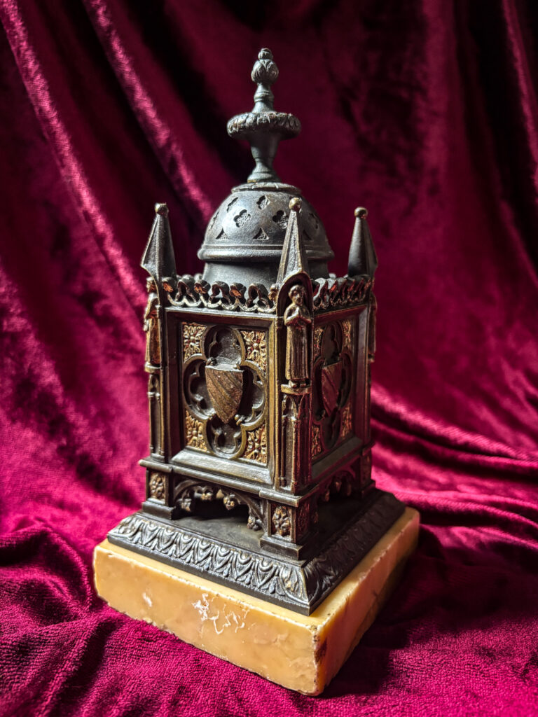 Reprenant l’architecture médiévale, cet objet rappelle le style Troubadour très en vogue sous Louis Philippe.
