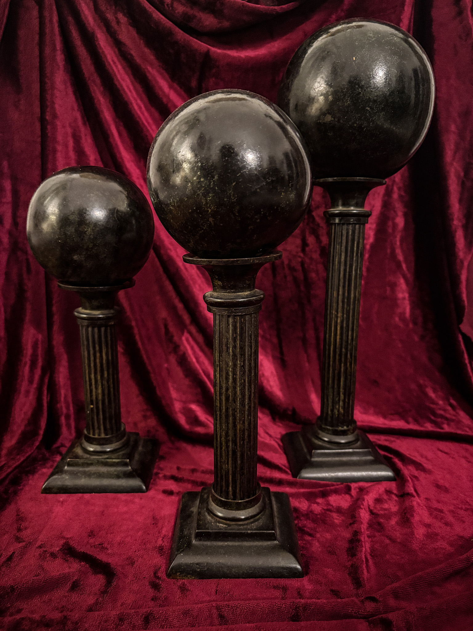 Ensemble néoclassique en bronze à patine brune de trois colonnes à fût cannelé à l’Antique supportant trois sphères de taille croissante.