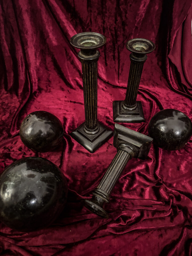 Ensemble néoclassique de trois colonnes et sphères en bronze
