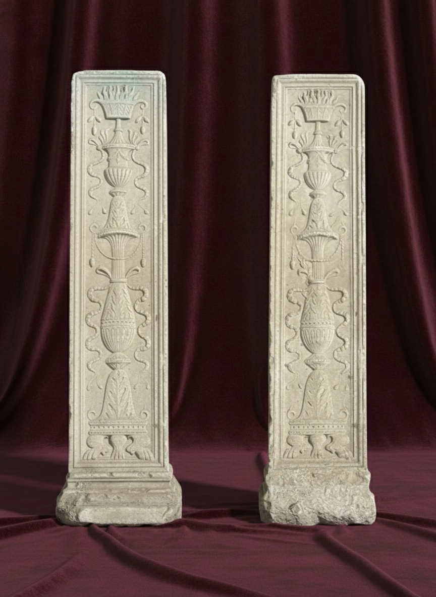 Très rare et exceptionnelle paire de pilastres en marbre blanc à décor en bas relief sculpté de deux torchères ou candélabres à l’Antique. Le piètement tripode en forme de pattes de lion surmonté d’un long fût orné de feuilles d’acanthe, la partie haute composée d’un vase de forme médicis supportant une coupe en corbeille de laquelle s’échappent des flammes. L’ensemble agrémenté de part et d’autre de rubans et de guirlandes de perles.