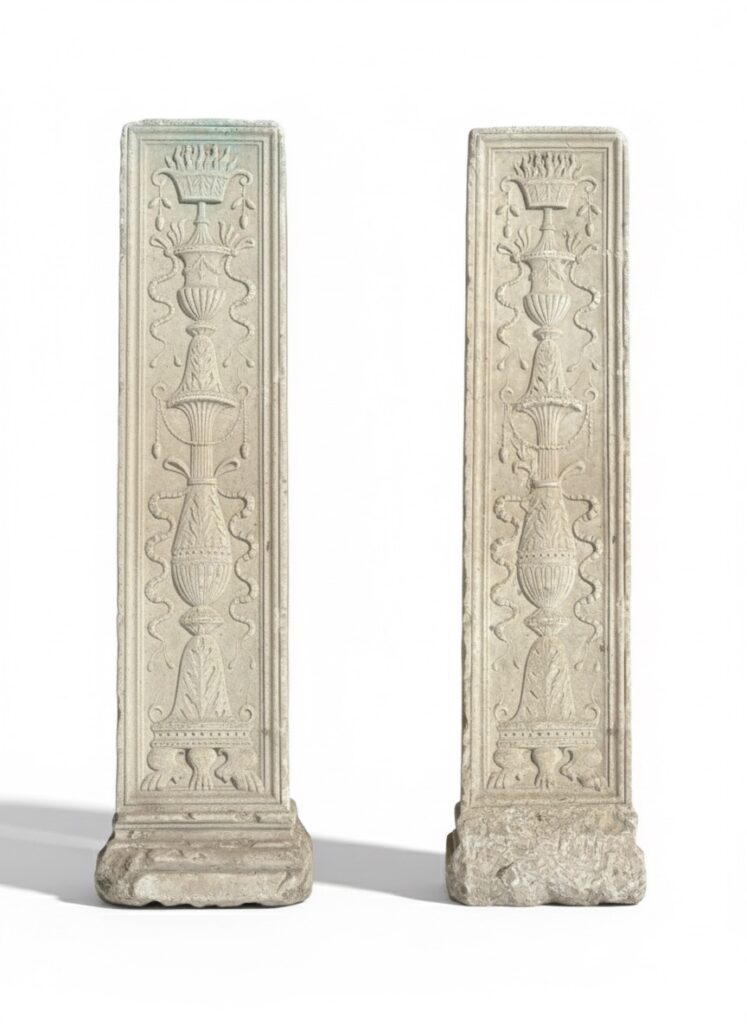 Jamais présentés sur le marché de l’art et donc totalement inédits, ces pilastres en marbre blanc massif sont proposés en exclusivité par Murmure des Arts.