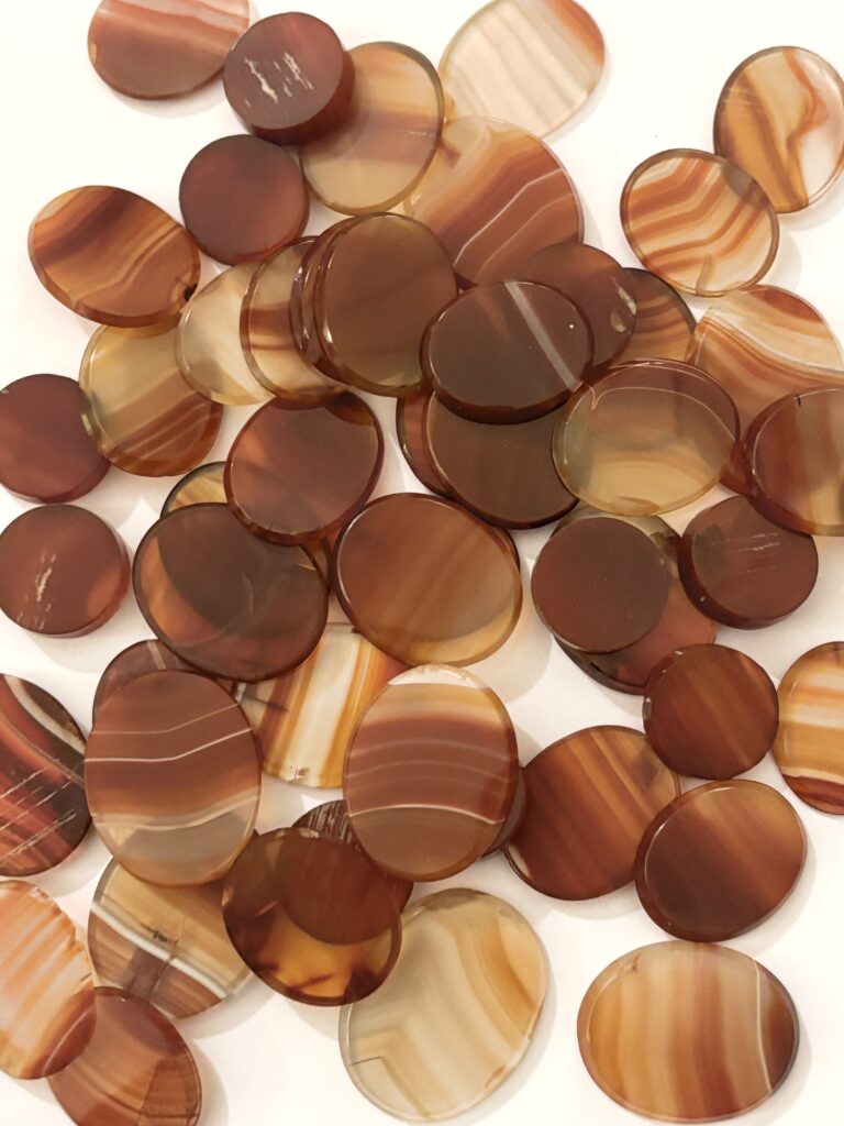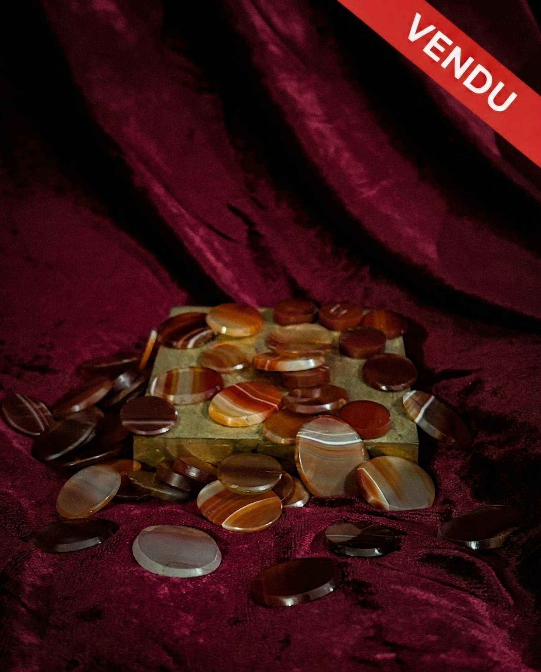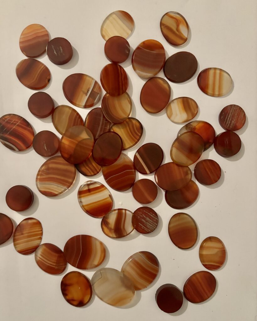 Fort lot de 50 cabochons en agate naturelle provenant d’un ancien stock d’antiquaire qui l’avait lui-même acquis auprès d’un ancien bijoutier spécialiste de la glyptique.
