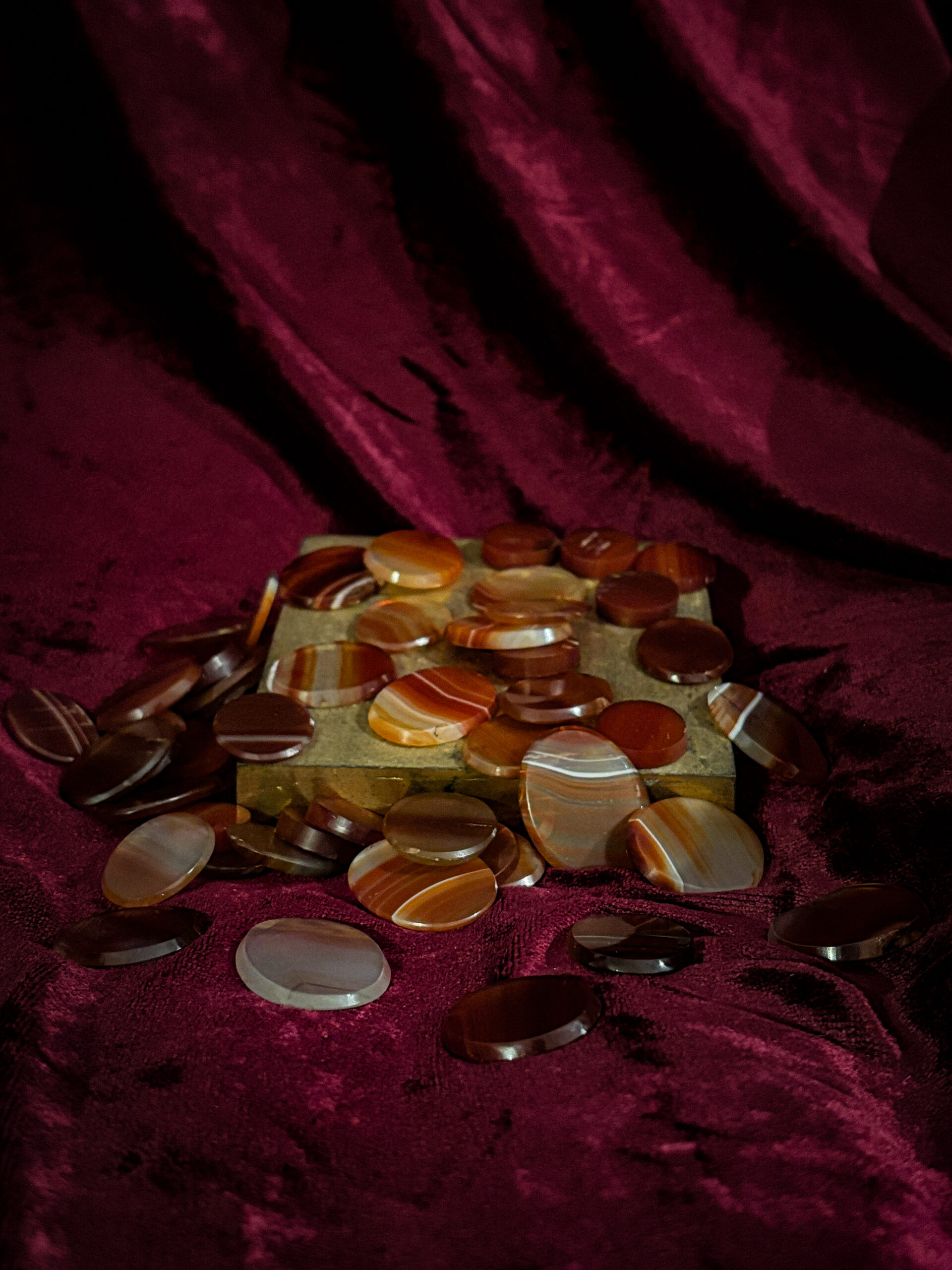Ces cabochons anciens sont idéals pour orner une bague, graver des initiales ou sculpter une scène dans le goût de l’Antique/ intailles. Ils peuvent également être utilisés pour l’incrustation.