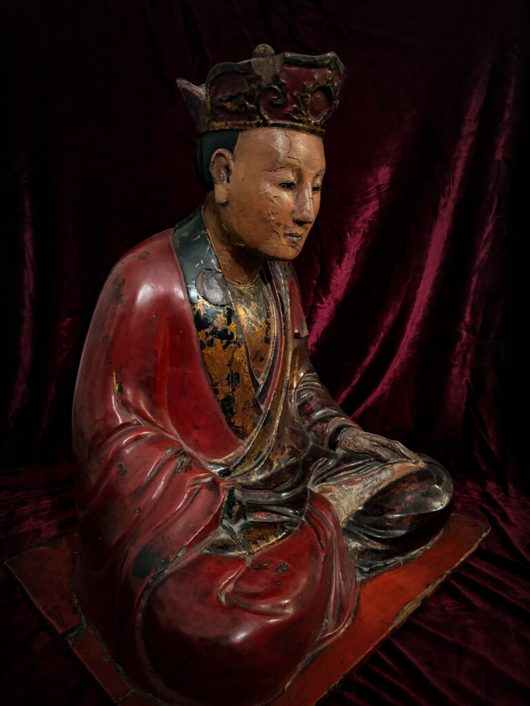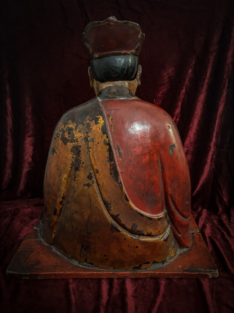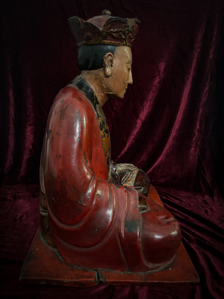 Grande statue de culte en bois laqué rouge, beige et or figurant un dignitaire assis vêtu d’un habit de cérémonie et d’un chapeau de fonctionnaire.