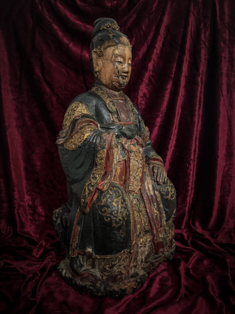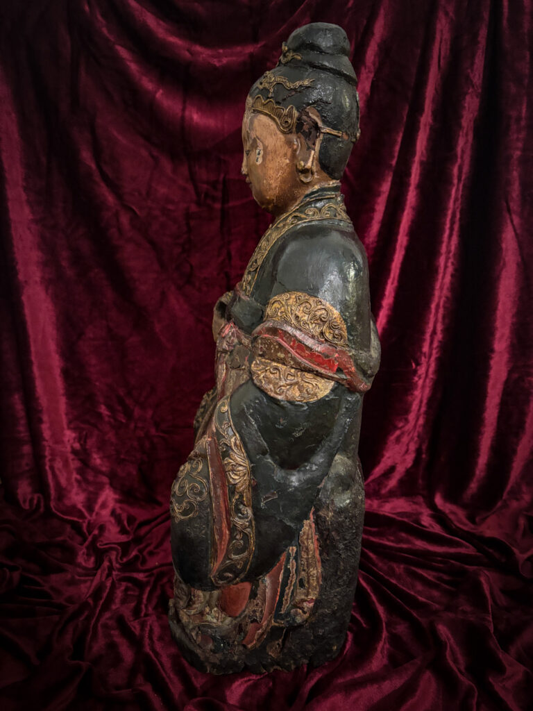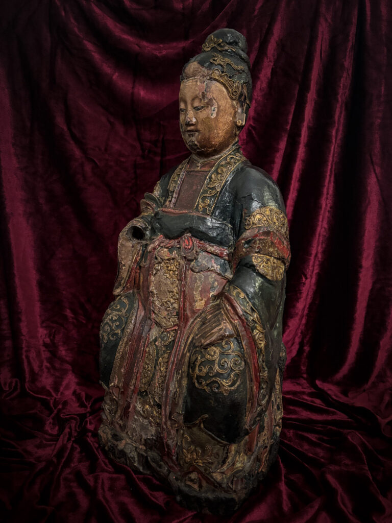 La figure hiératique assise, la main gauche sur le genoux, la tête richement parée de bijoux et d’un diadème. Vêtue d’une longue robe bleu vert et rouge abondamment agrémentée de rinceaux stylisés en relief délicatement dorés.